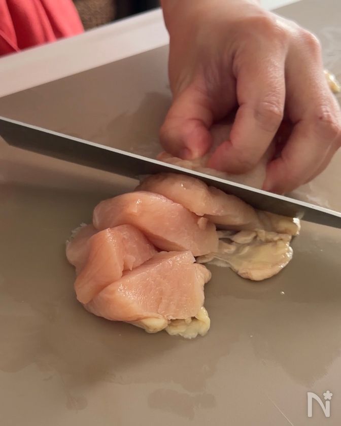 (1) 鶏胸肉はフォークで全体を数箇所刺したら、1cm幅の削ぎ切りにする。