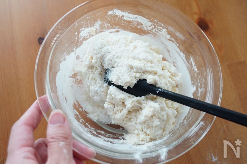 (2) なめらかになったら、お米の粉 お料理自慢の薄力粉と【B】を加えてしっかり混ぜ合わせる。
