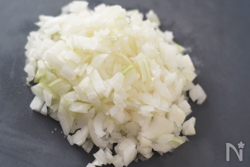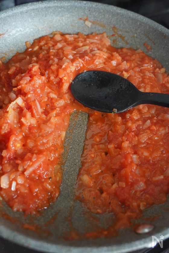 (8) 7と同じフライパンに玉ねぎを加え、弱火で炒める。しんなりしたらおろしにんにく、おろししょうが、トマト缶を加えてトマトを崩しながら炒める。