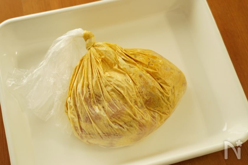 (5) 鶏むね肉は皮を取り除き、1cm幅のそぎ切りにしたら、ポリ袋に入れる。【C】を加えよくもみ込み、冷蔵庫で30分〜一晩漬ける。