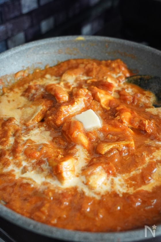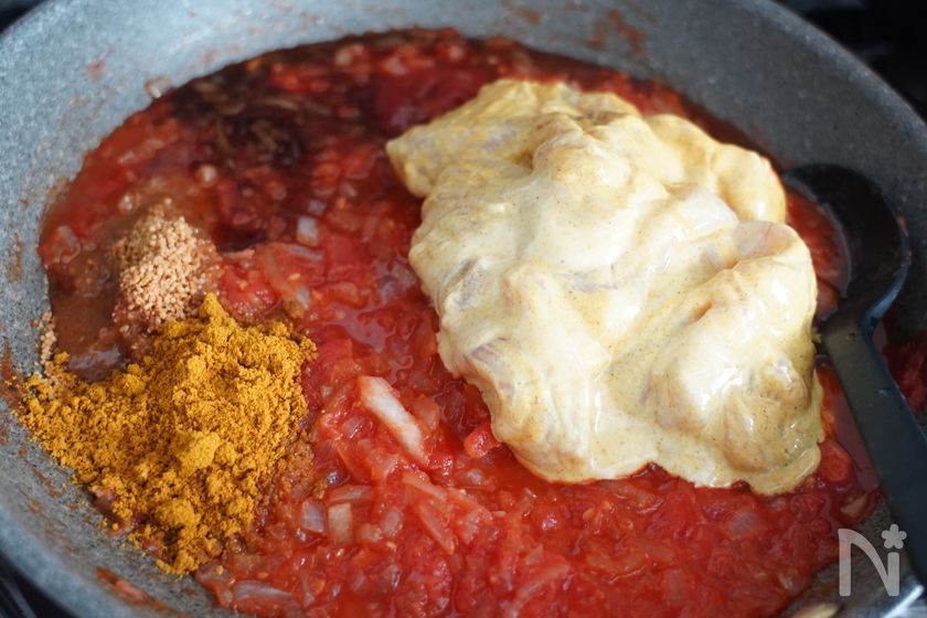 (9) 5の鶏むね肉をヨーグルトごと加え、さらに【D】を加えて混ぜながら7〜8分煮込む。