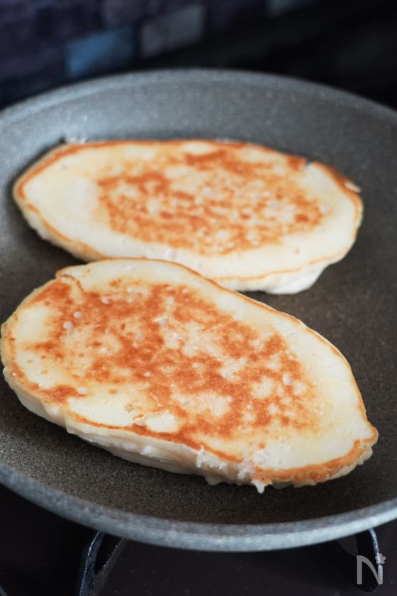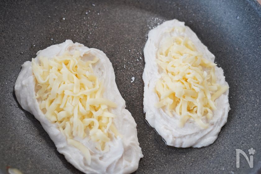 (3) フライパンに薄く米油をひき、2を1/4広げる。楕円形になるように成形し、ピザ用チーズをのせる。同様に2つ作ったら、チーズを覆うように残りの生地をのせる。