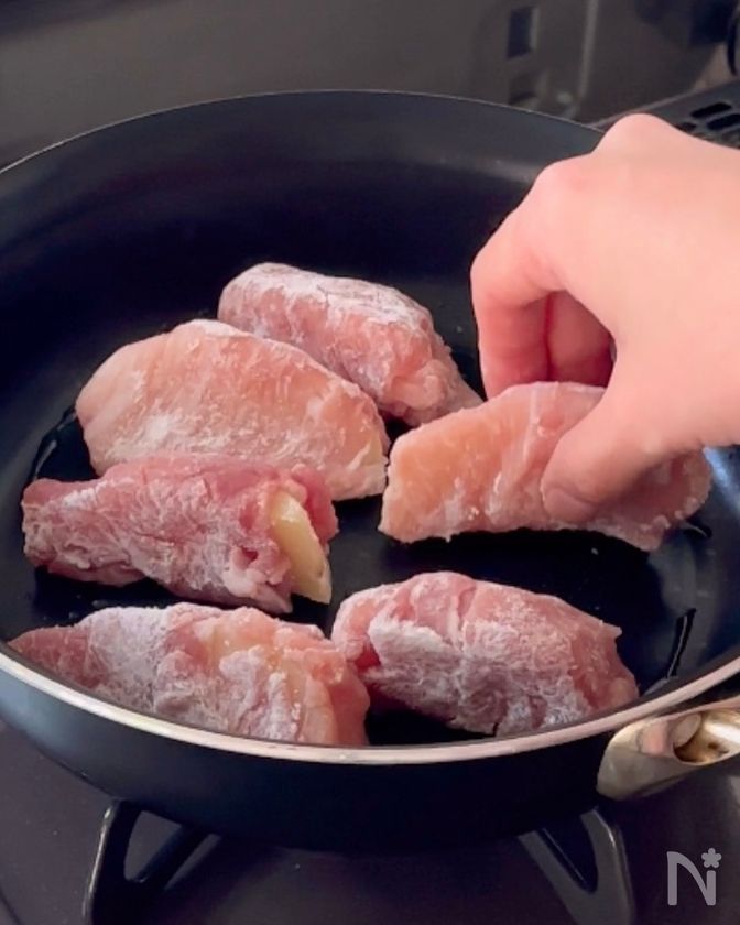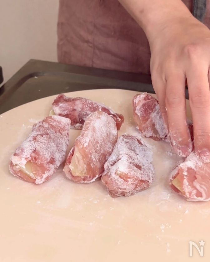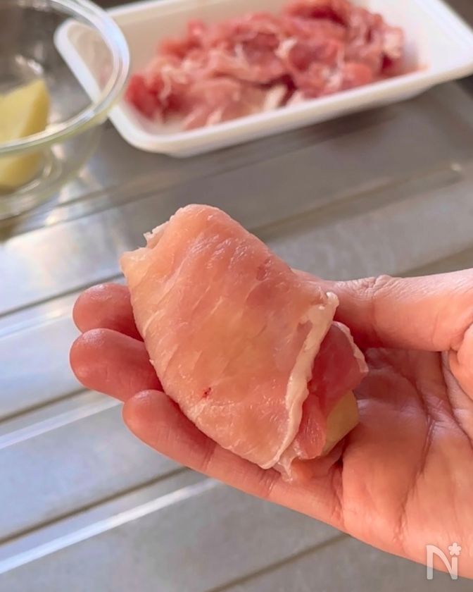 (3) 豚こま肉を広げ、じゃがいもをのせてくるくる巻く。