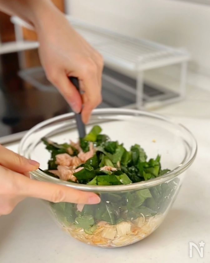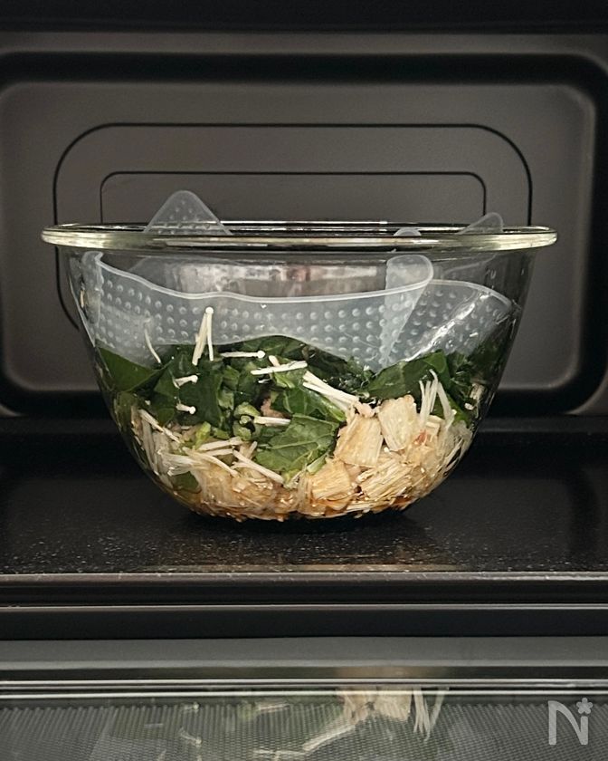 (1) 耐熱ボウルに小松菜、えのき、乾燥わかめ、軽く汁気を切ったツナ缶、【A】を入れ軽く混ぜ合わせる