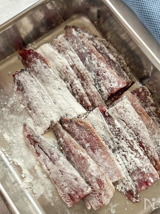 (2) 小麦粉を全体にまぶす。