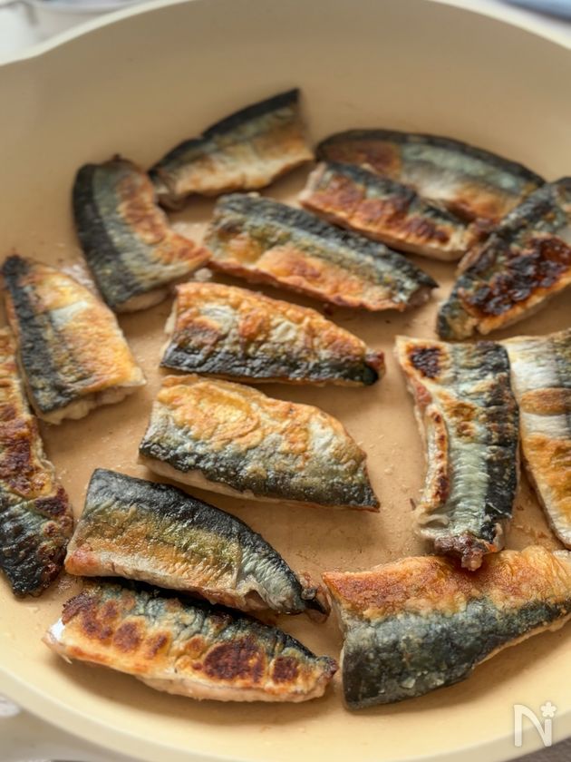 (3) フライパンに油を熱し、皮を下にしてさんまを入れ、中火で両面をこんがり焼く(片面2~3分ずつ)。