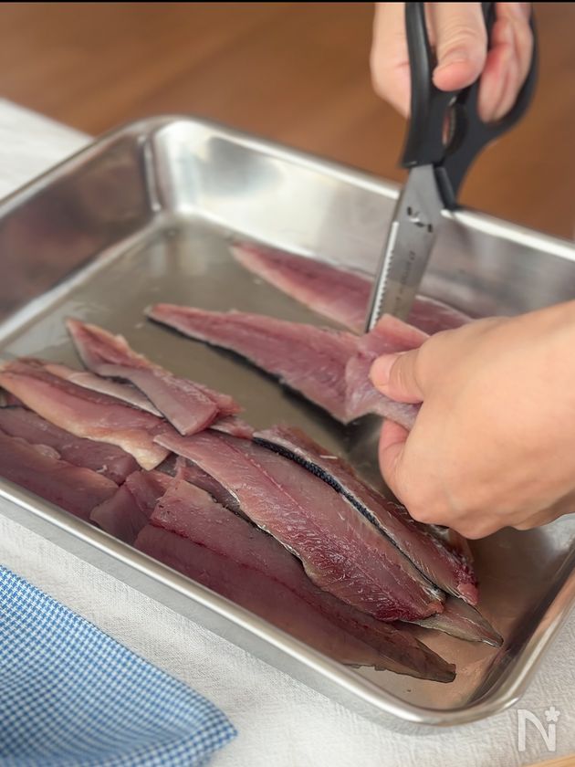 (1) さんまをハサミで半分に切り、塩をふって5分ほど置き、キッチンペーパーで水気をふく。