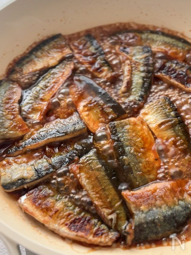(5) こんがり焼けたさんまにタレをかけ、とろみがついたら完成!