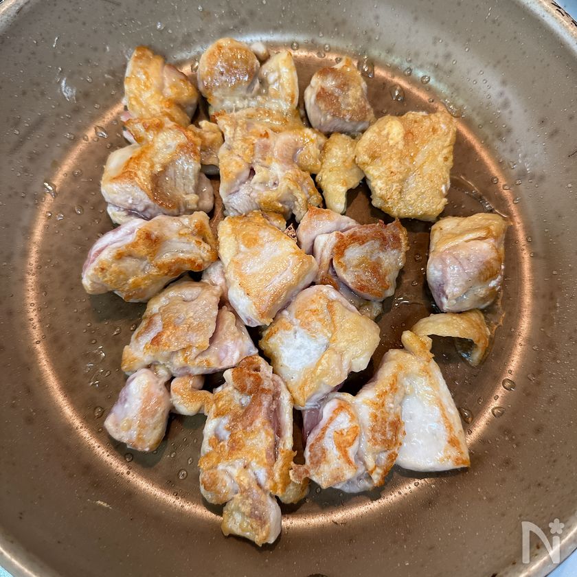 (2) フライパンにサラダ油をひき、1の鶏もも肉を中火で焼き色をつける。