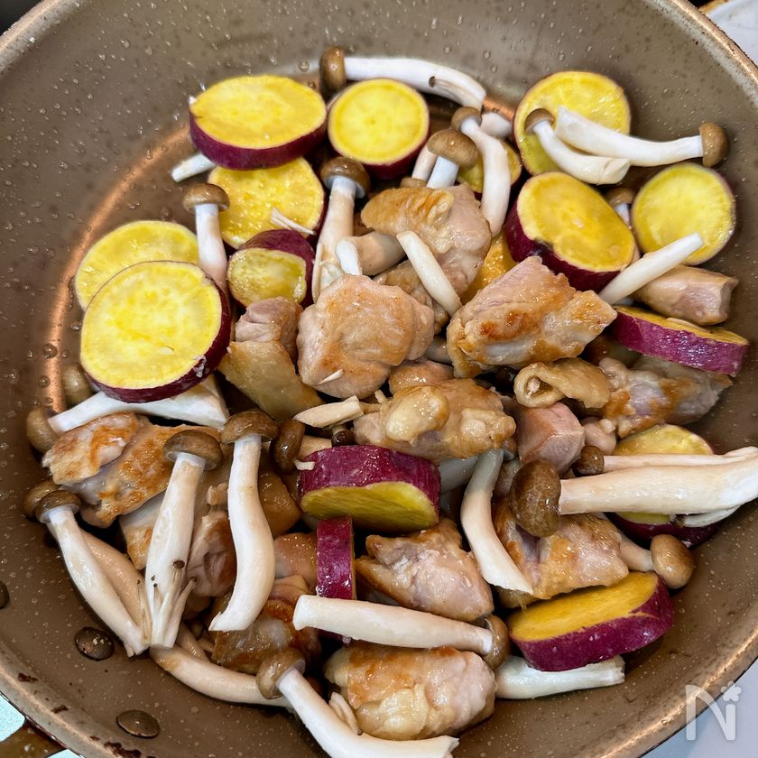 (3) 鶏もも肉に火が通ったら1のさつまいもとしめじを加えて油が回るまで炒める。