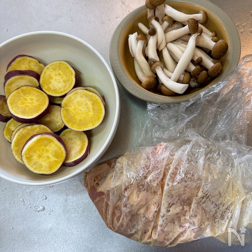 (1) 鶏もも肉はひと口大に切り【A】をもみ込み、薄力粉をまぶす。しめじは石づきを切り落としてほぐしておく。さつまいもは8mm幅の輪切り後5分水にさらす。水を流して耐熱容器に入れてラップをかけて、レンジ(600w)で4分程度加熱しておく。
