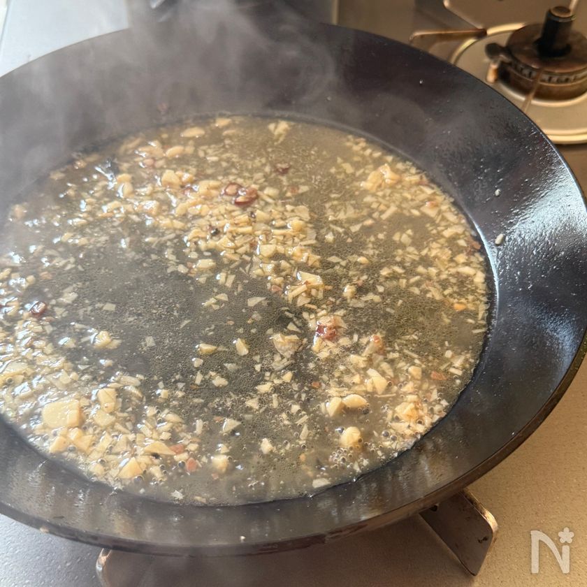 (3) 1のフライパンにオリーブオイル大さじ1を足し、にんにく、みじん切りにしたアンチョビフィレ(又はさんまのはらわた)、鷹の爪小口切りを入れて弱火で焦がさないようじっくりと炒めて香りを出す。