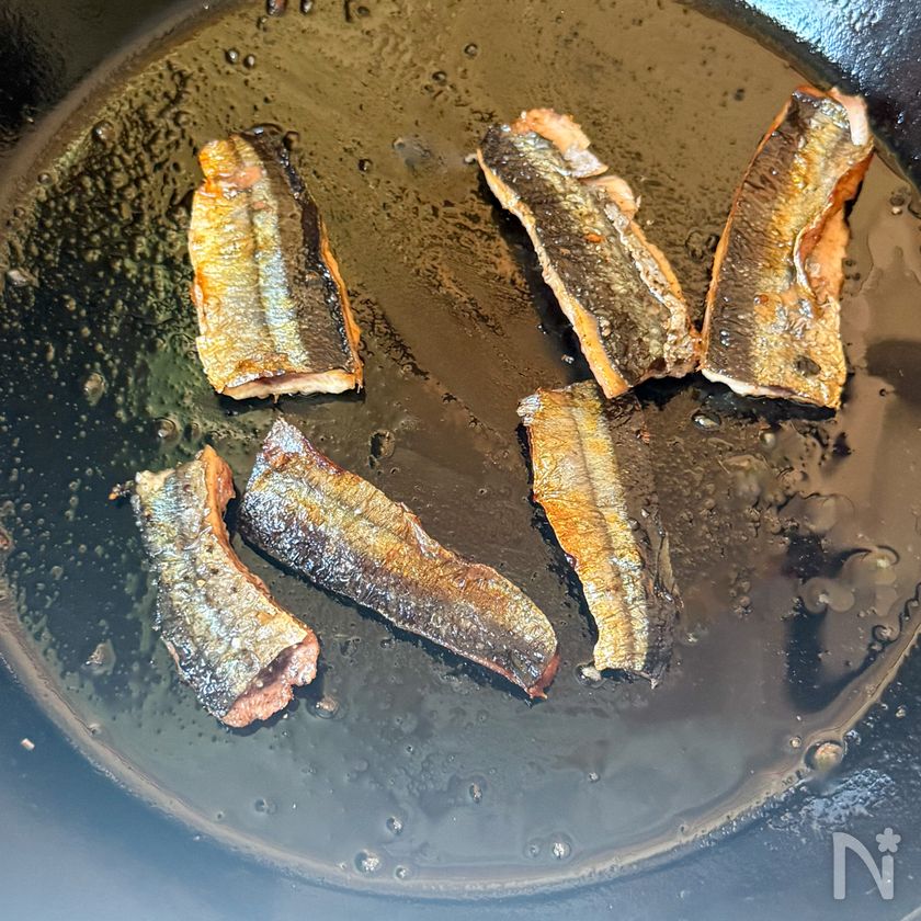 フライパンにオリーブオイル大さじ1を熱し、さんまを皮の方から3-4分焼く。反対側も3-4分程焼き、さんまにしっかり火が通ったら、鍋から取り出す。