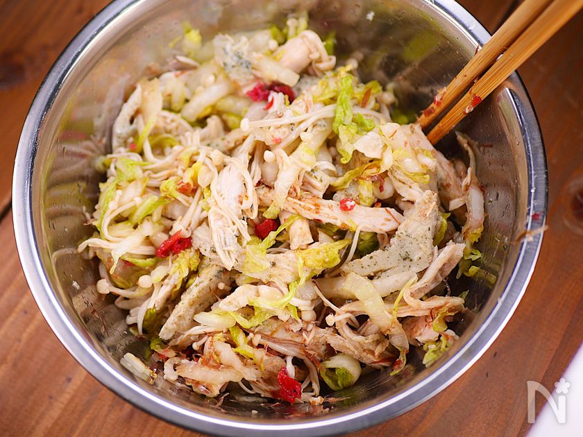 (4) ボウルに白菜(水気を手で握ってしっかりと絞る)、えのき、サラダチキン、梅干し(果肉)、【B】を加え、和える。