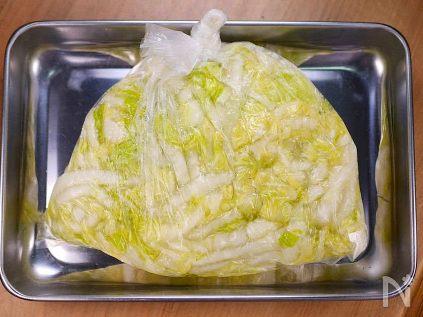 (1) 白菜は繊維を断ち切るように7~8㎜の細切りにし、ポリ袋に入れ、【A】を加え浅漬けにする(約30分)