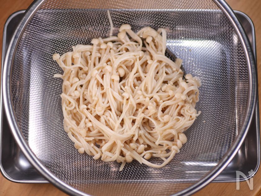 (2) えのきは根元を切り落とし、約1分湯がき、ざるに上げ、そのまま冷ます(おか上げ)