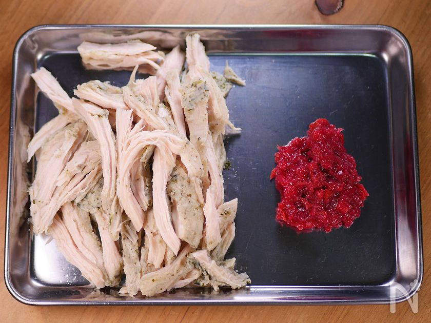 (3) ○サラダチキン(市販)は細かく手でほぐす。