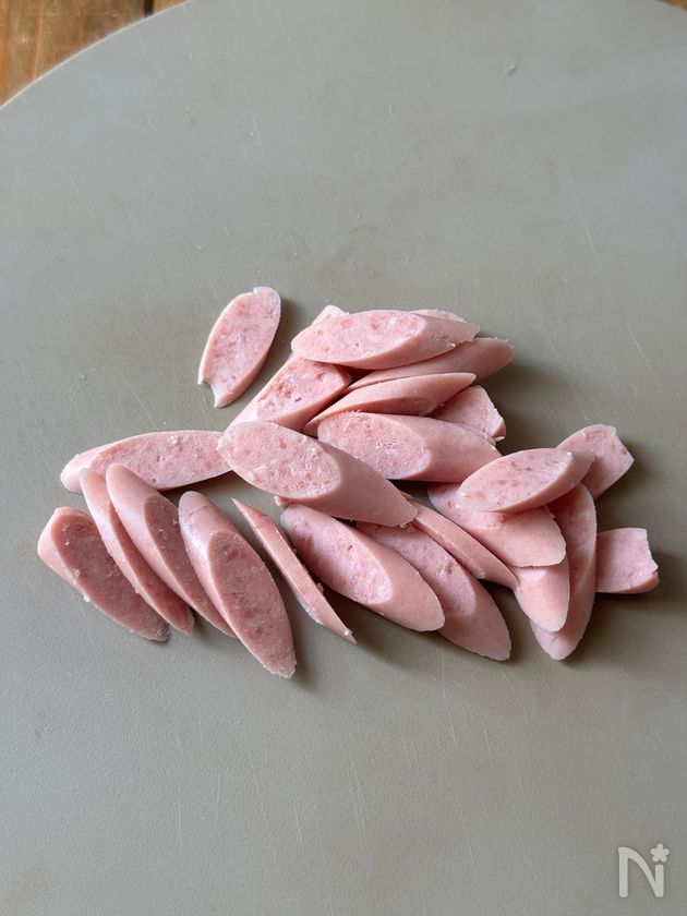 (1) ・ポールウインナーは斜め薄切りにする。