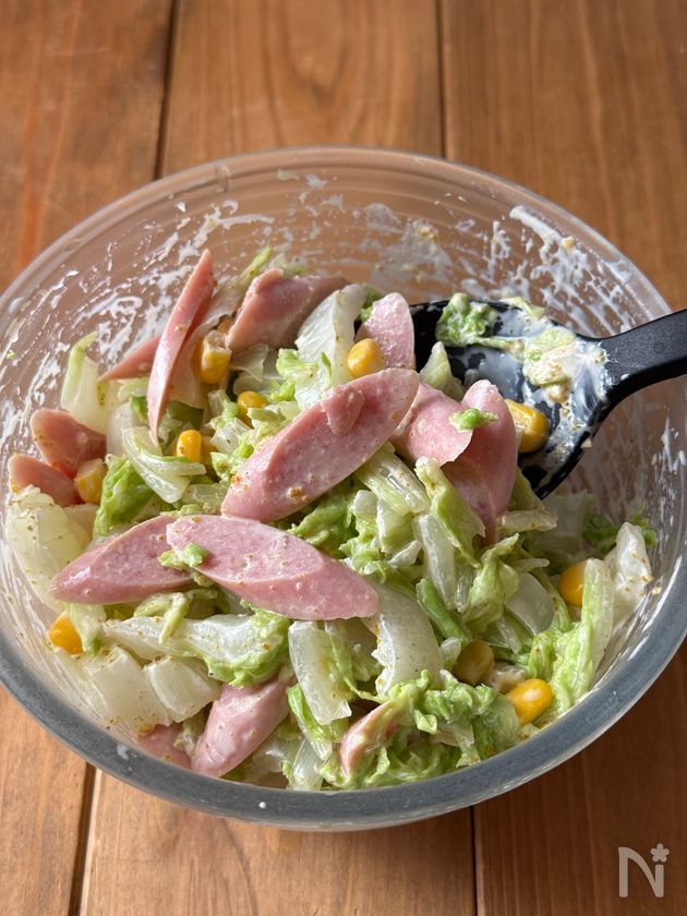 (2) 白菜が入った容器に、ポールウインナー、コーン、【A】をいれ混ぜ合わせる。