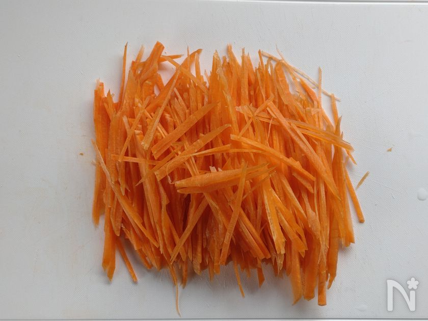 (1) にんじんは千切りにする。