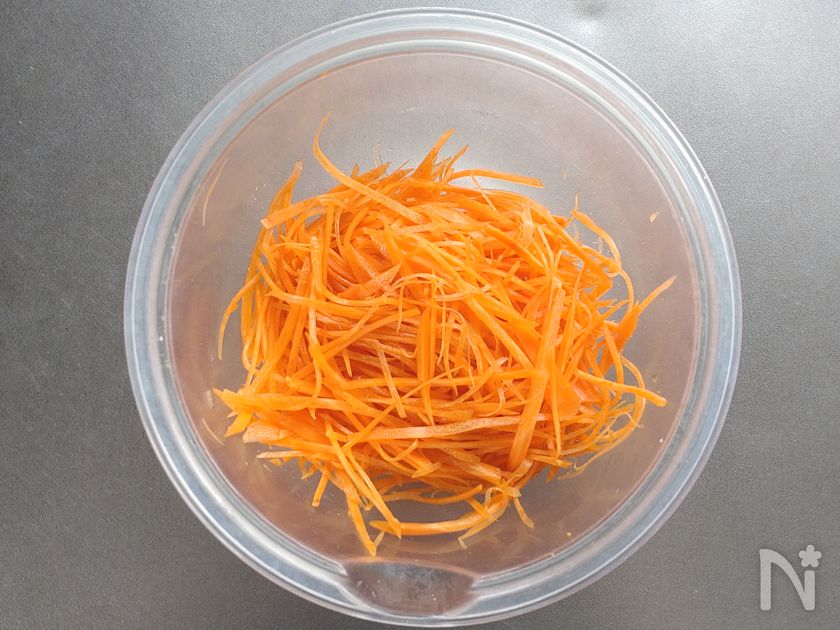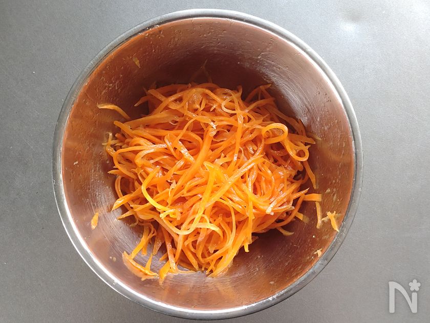 (2) ボウルににんじんを入れ、塩を加えて揉み込み、10分ほど置く。