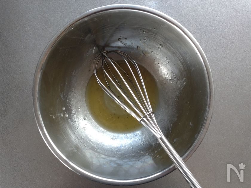 (3) 別のボウルに【A】を入れて混ぜたらオリーブオイルを加え、白っぽくなるまで混ぜる。(軽く乳化させる)