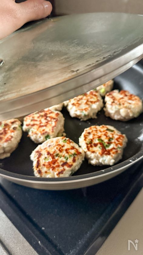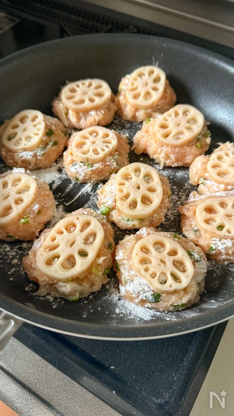 (4) 薄く油を引いたフライパンに肉だねを丸めて並べる。片栗粉を振ってれんこんを上に押し込みながらおき、中火で焼く。