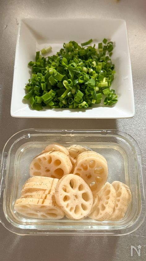 (1) れんこんは皮ごと3〜4mmの輪切りにする。小ネギは輪切りにする。