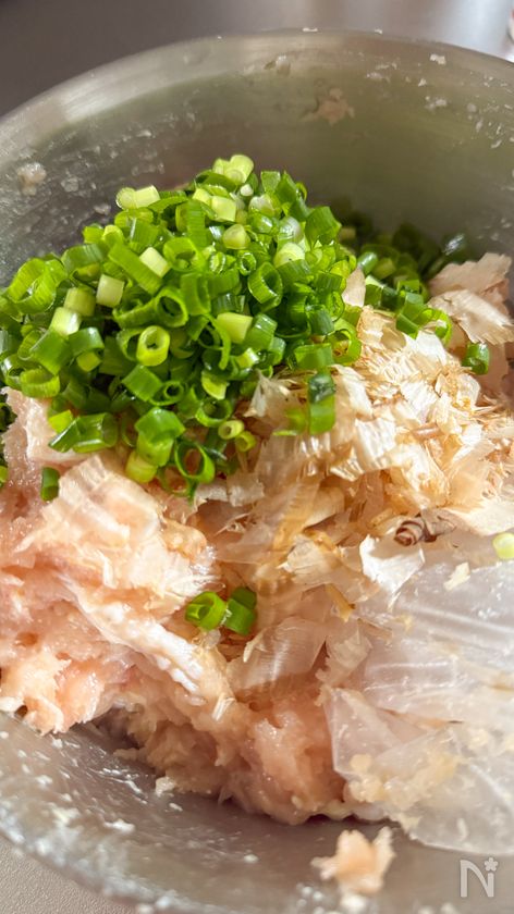 (3) さらに、小ネギ、あれば花かつおを加えて混ぜ合わせる。