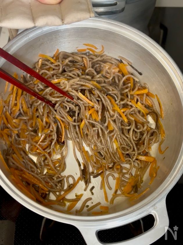 (1) 小鍋にごま油を入れ、人参を炒めしんなりしたらしらたき、塩こんぶ、【A】を入れて汁気がなくなるまで炒める