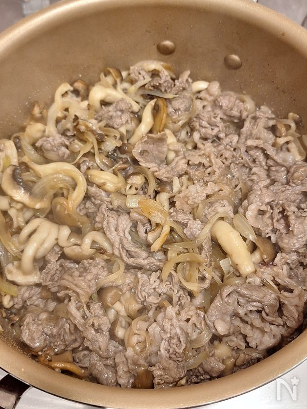 (5) 少し焼き目がついたら牛肉を加え、色が変わるまで炒め合わせる。