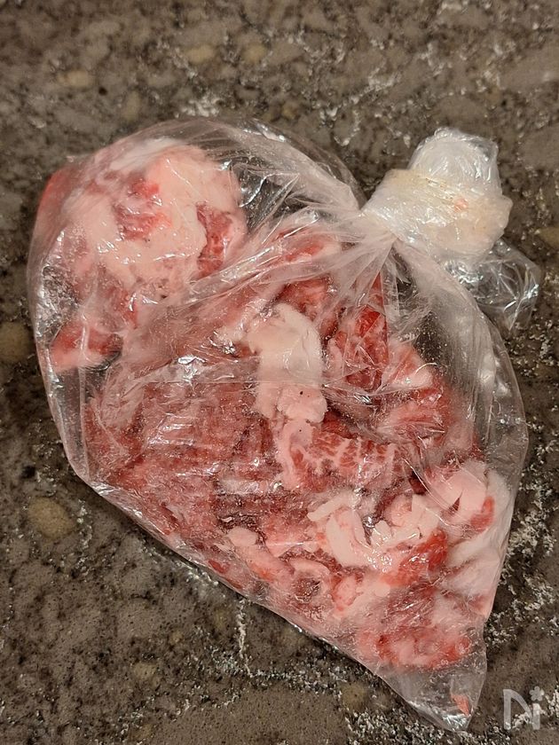 (1) 牛細切れ肉と【A】をポリ袋でもみこむ。