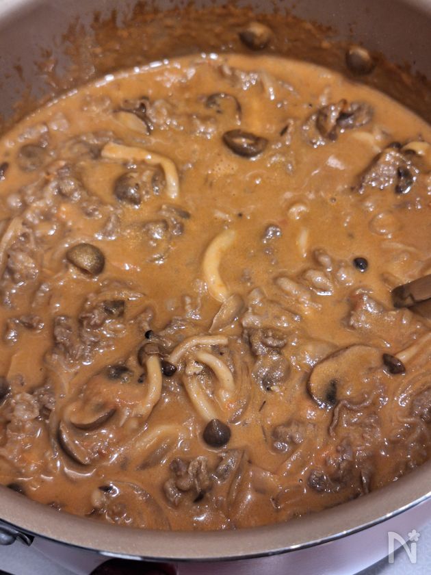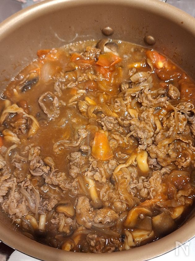 (7) デミグラスソース缶を加え、ふたをして5分煮込む。