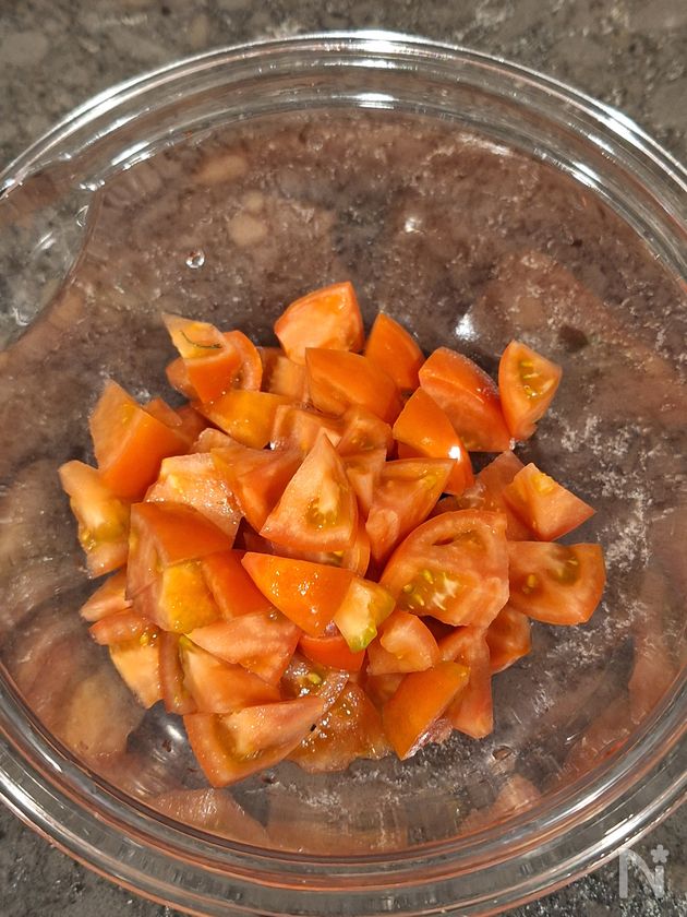 トマトは1.5cm幅のくし切りにした後、サイズを2等分する。