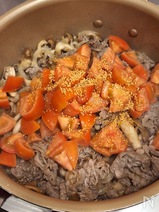 (6) トマトとコンソメ顆粒を加え、少し火を弱めて5分、ふたをして煮込む。