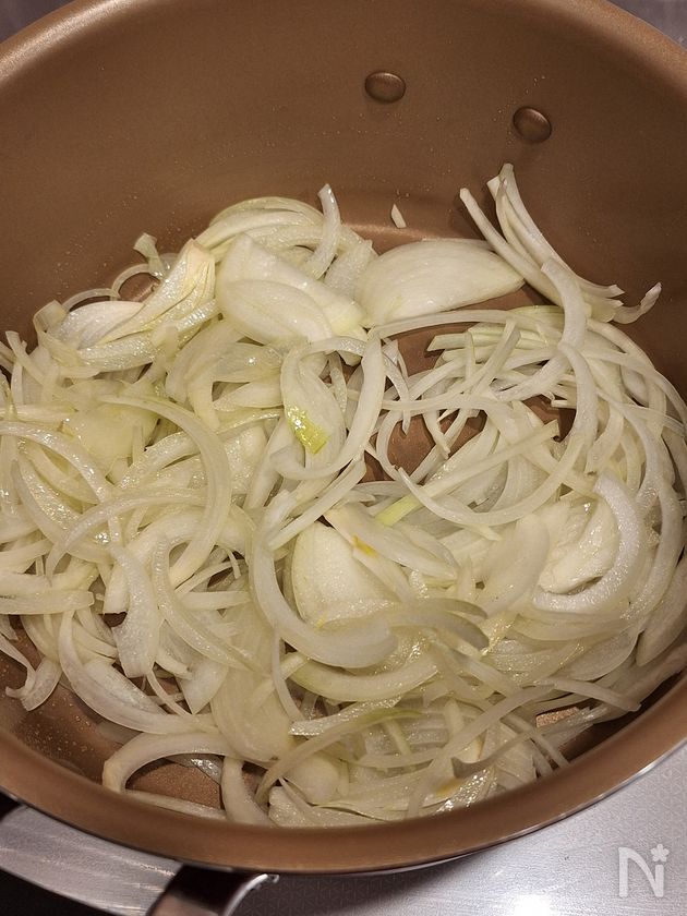 (3) フライパンにオリーブオイル小さじ1を熱し、たまねぎを炒める。