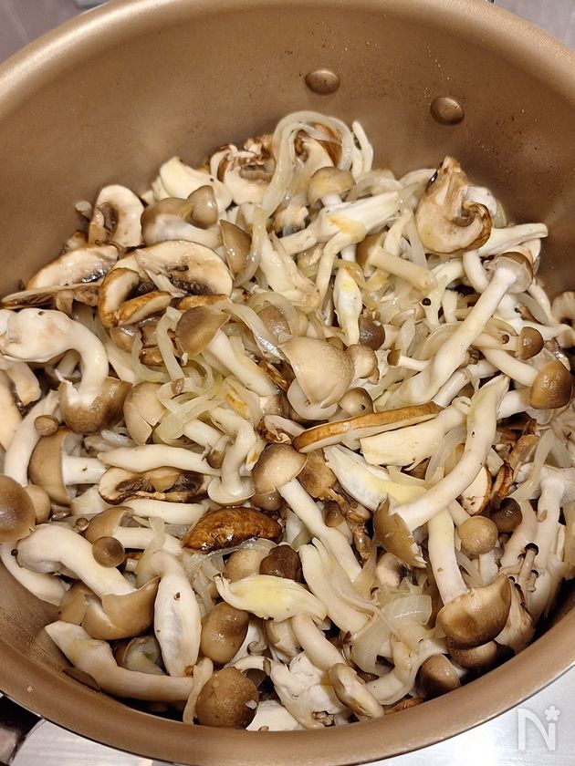 (4) たまねぎに透明感が出たら、マッシュルームとしめじ、オリーブオイル小さじ1を加えて炒め合わせる。