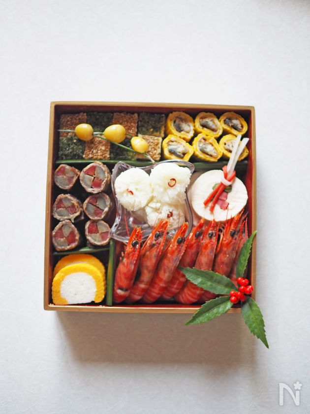 (3) ②の汁けをきって、それぞれ縦4等分に切り、各2本ずつを市松になるように合わせる。