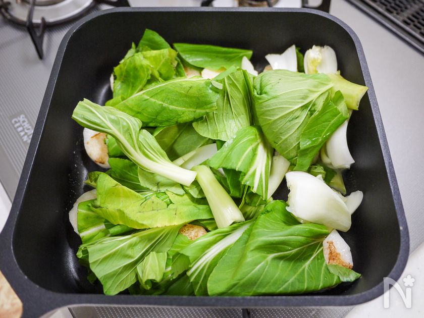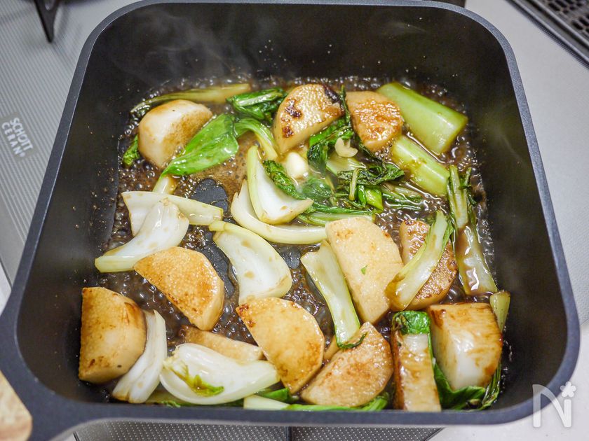 (3) 長芋に焼き色がついてきたらチンゲン菜を加えます