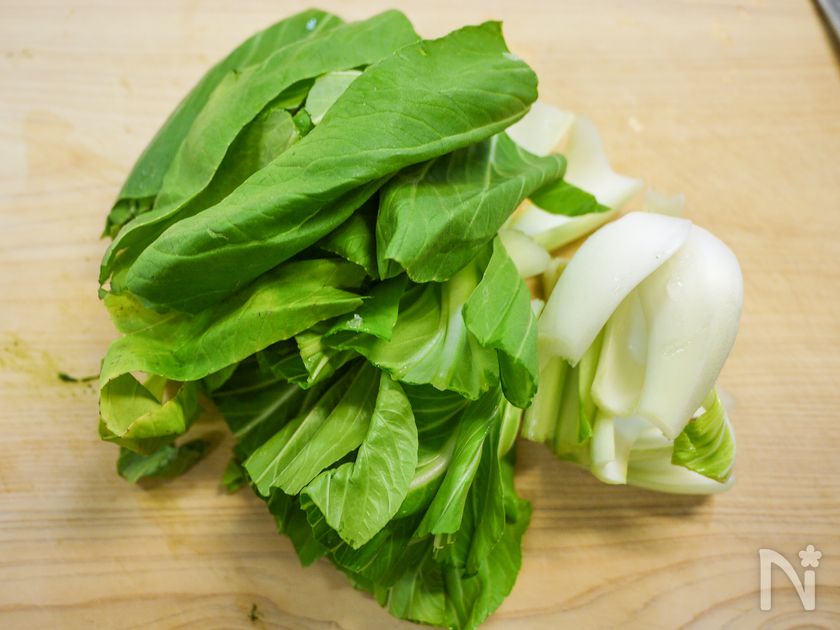 (1) チンゲン菜は根の部分をしっかりと洗ってから