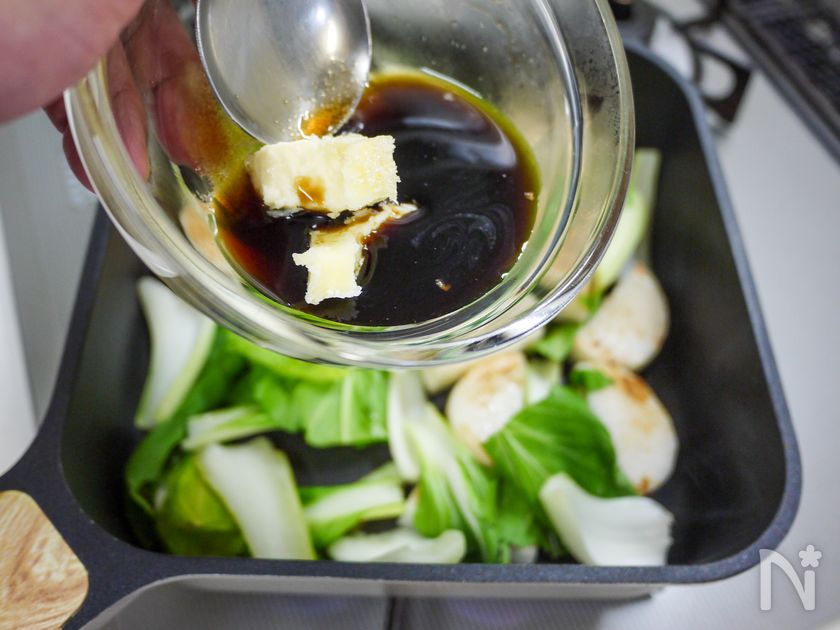 (4) チンゲン菜がしんなりしてきたら【A】を加えます