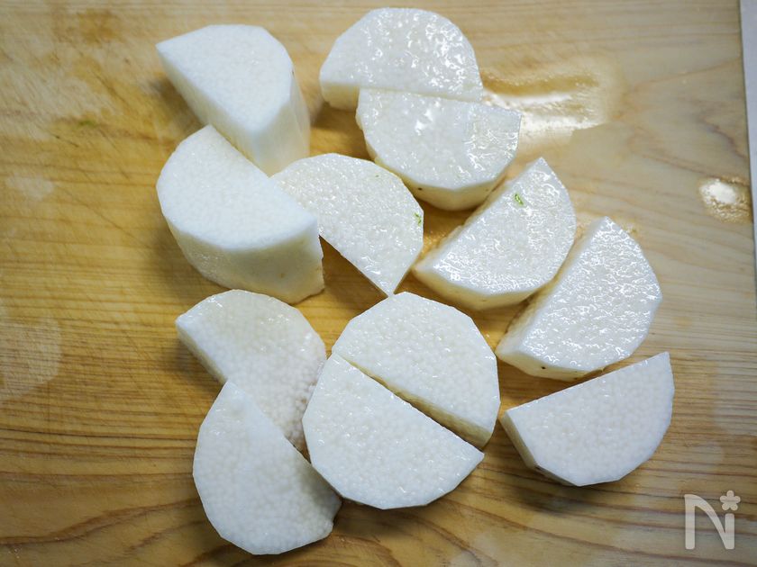 (下準備) 長芋は1.5㎝厚さの半月切りにします