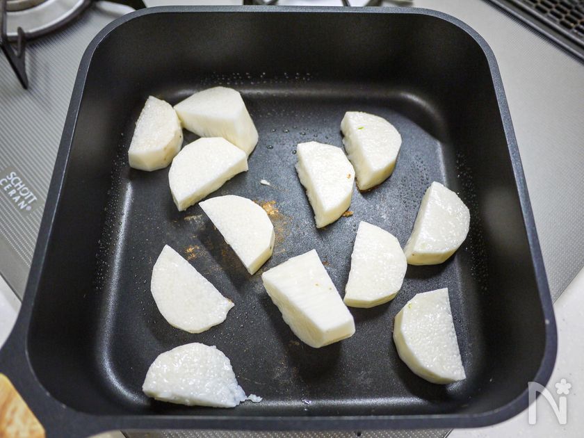 (2) 熱したフライパンにサラダ油を薄く塗って長芋を