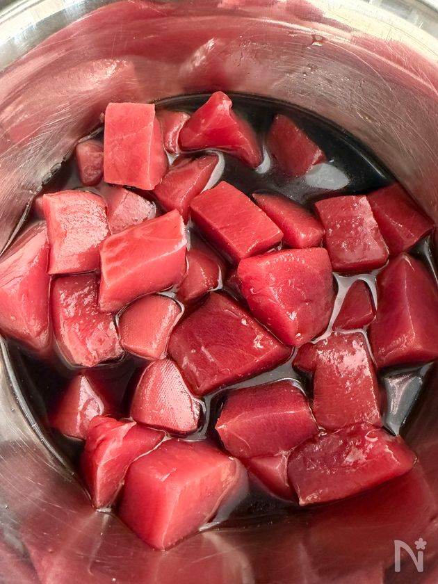 (1) 醤油を入れて混ぜたらマグロを入れて10分漬け込む。