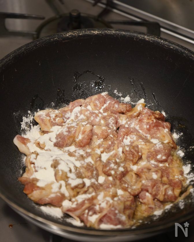 (2) 食べやすい大きさに切った豚肉薄切りをフライパンに入れ【A】をいれよく揉み込み5分ほど置きます
