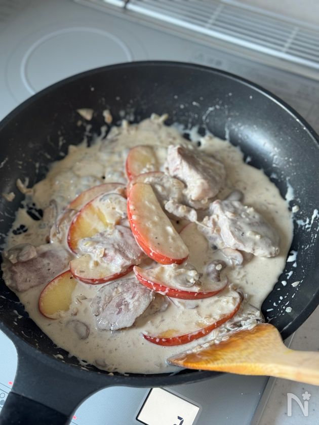 (4) 弱火(IHヒーター火力ランプ[2~3])にし、【A】を加えて豚肉、りんごを戻し入れ、混ぜながら2分ほど加熱する。塩、こしょう各少々で味を調える。