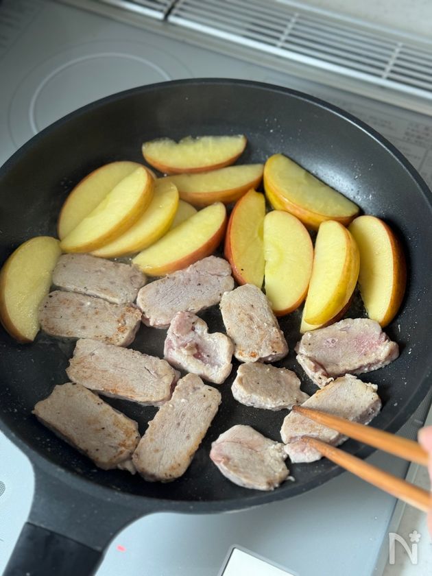 (2) フライパンにバターを入れ、中火(IHヒーター火力ランプ[5])で加熱し、バターが溶け始めたらりんごを入れて時々裏返しながら3分ほど焼く。端に寄せて豚肉を入れ、両面が焼けるまで2分ほど加熱し、いったん取り出す。