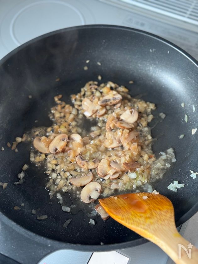 (3) 同じフライパンに玉ねぎ、マッシュルームを入れて中火(IHヒーター火力ランプ[4])で3分炒める。白ワインを加え、1分ほど煮詰める。