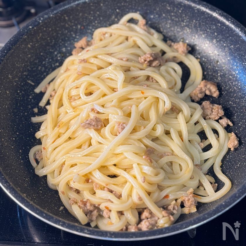 (3) ひき肉に火が通ったら、フライパンの半分に寄せ、空いたスペースに温めたうどんを加えて軽く焼きつけ、全体を炒め合わせる。