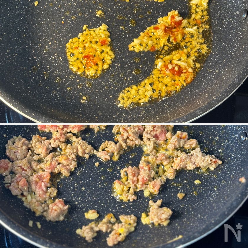 (2) フライパンに【A】とにんにく・生姜を入れて中火にかけ、香りが立つまで炒める。豚ひき肉を加え、ほぐしながらそぼろ状になるまで炒める。